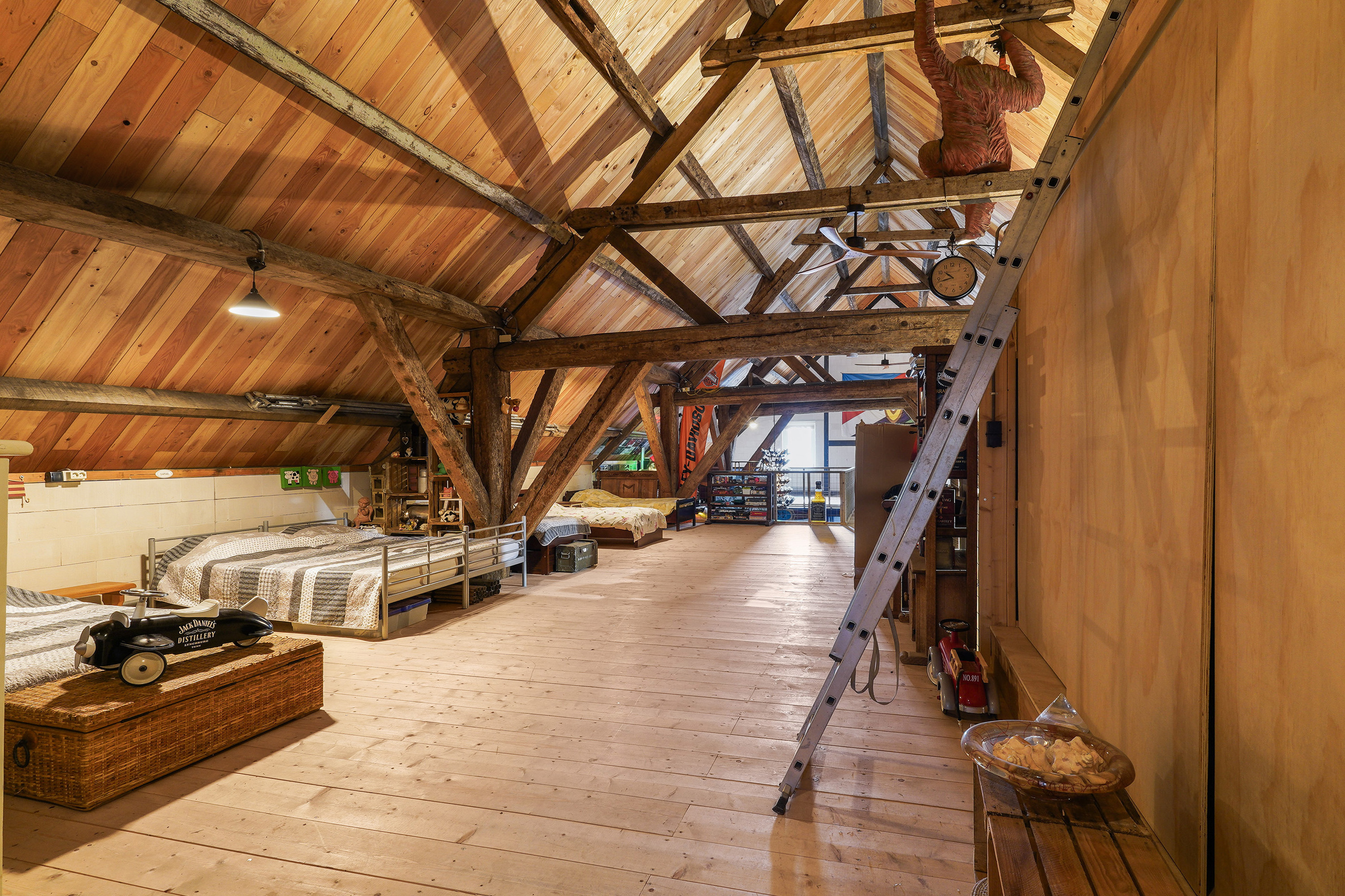 And then… accessible via the utility room, the garage or the veranda at the rear… the bar. Fully equipped with refrigeration units, its own restroom with toilet and urinal, and an impressive mezzanine reaching up to the roof ridge. Even from the attic level you can look down into the bar. This is a space that must be experienced.
