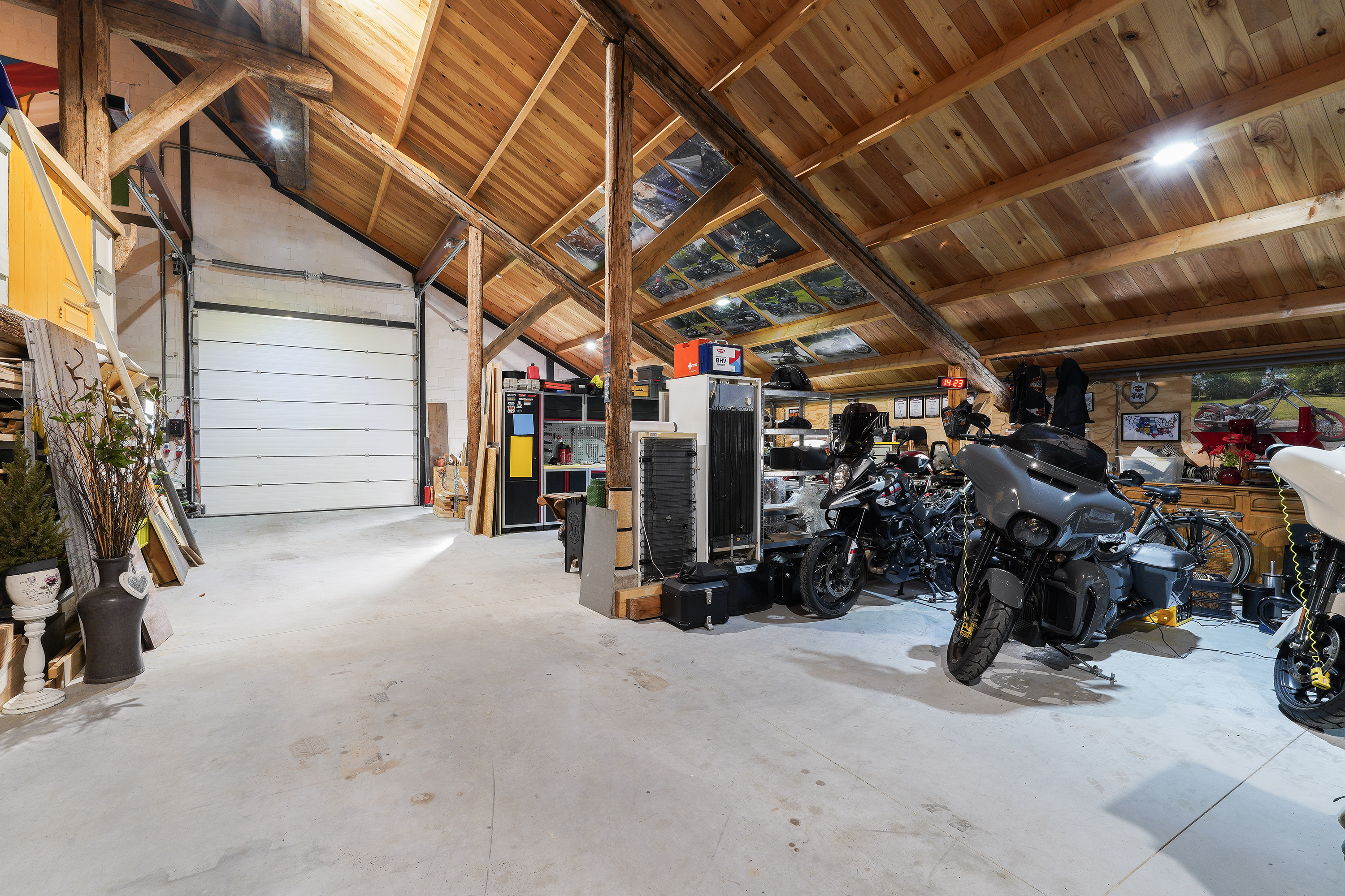 The adjoining garage hardly does justice to its name. With approximately 160 m² of space, a large sectional door at the rear measuring 3.5 meters in both width and height, a loft and additional indoor areas, it is a dream for car enthusiasts, camper storage, collectors or hobbyists. A large van can easily drive inside.