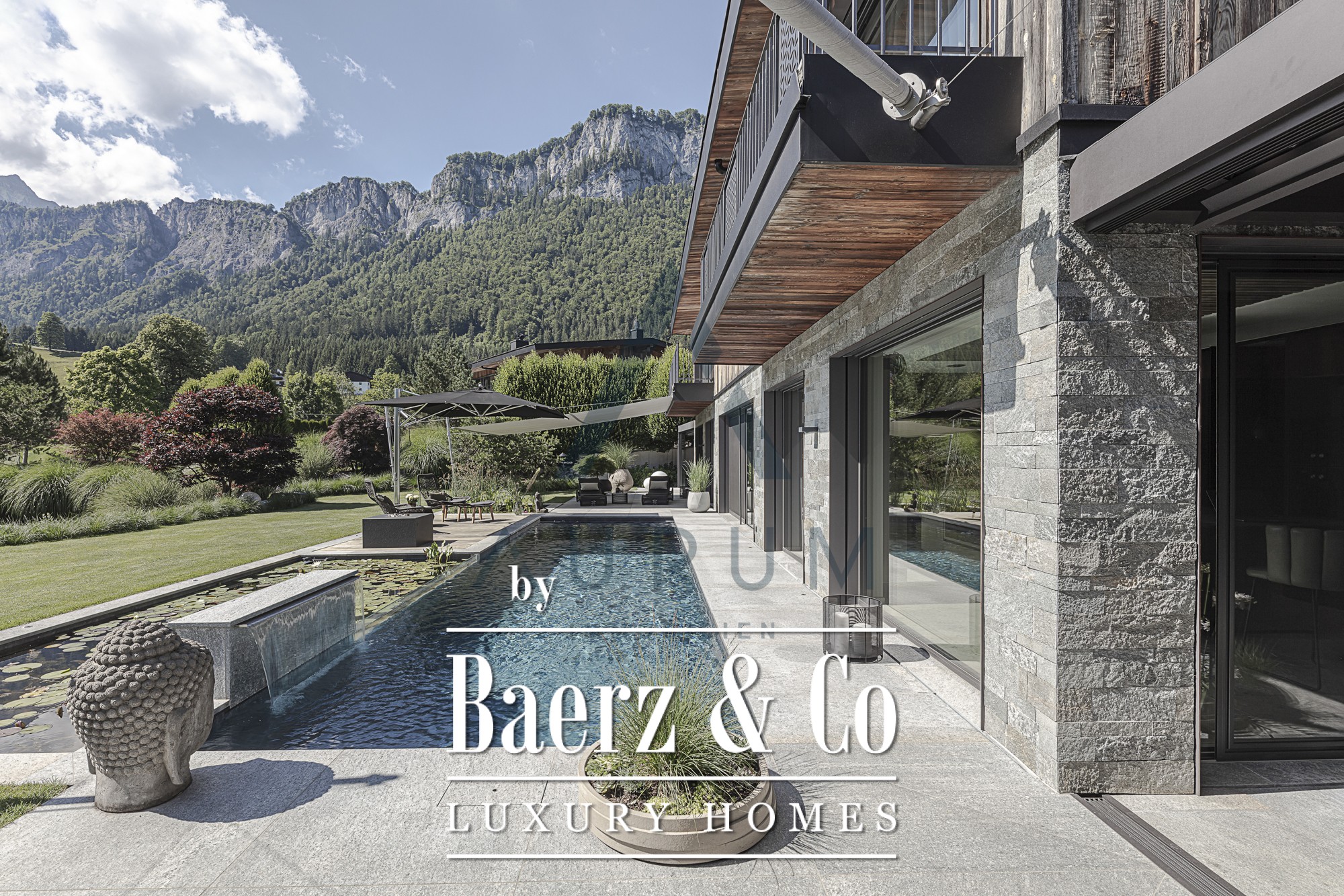 The main living area flows seamlessly toward park-like grounds, where natural stone terraces, two RENSON pergolas, and an automated awning system frame unobstructed panoramic views. A heated outdoor pool borders a water lily pond, while Kettal furnishings and a gas fireplace create an inviting sun deck, ensuring year-round enjoyment of the alpine surroundings. The chalet’s wellness and fitness suite features a sauna, steam shower, and professional gym equipment, offering restorative depth within your own domain.