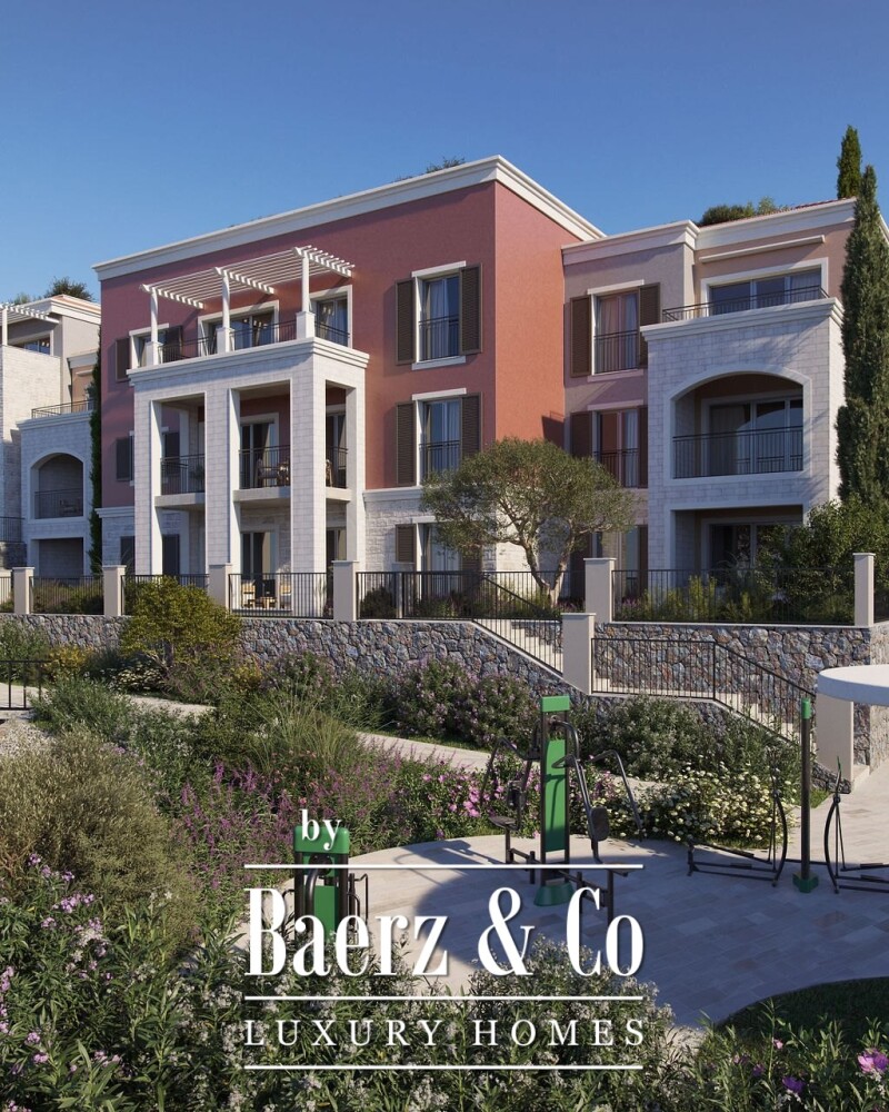 Communal landscaped gardens planted with lavender and olive trees, a private pool, and a dedicated fitness and yoga zone invite residents into relaxed rhythms of the Mediterranean. The Adriatic is 1.5km away, with Tivat and Podgorica airports easily accessible. Completion is scheduled for December 2027, offering a secure retreat with every contemporary amenity.