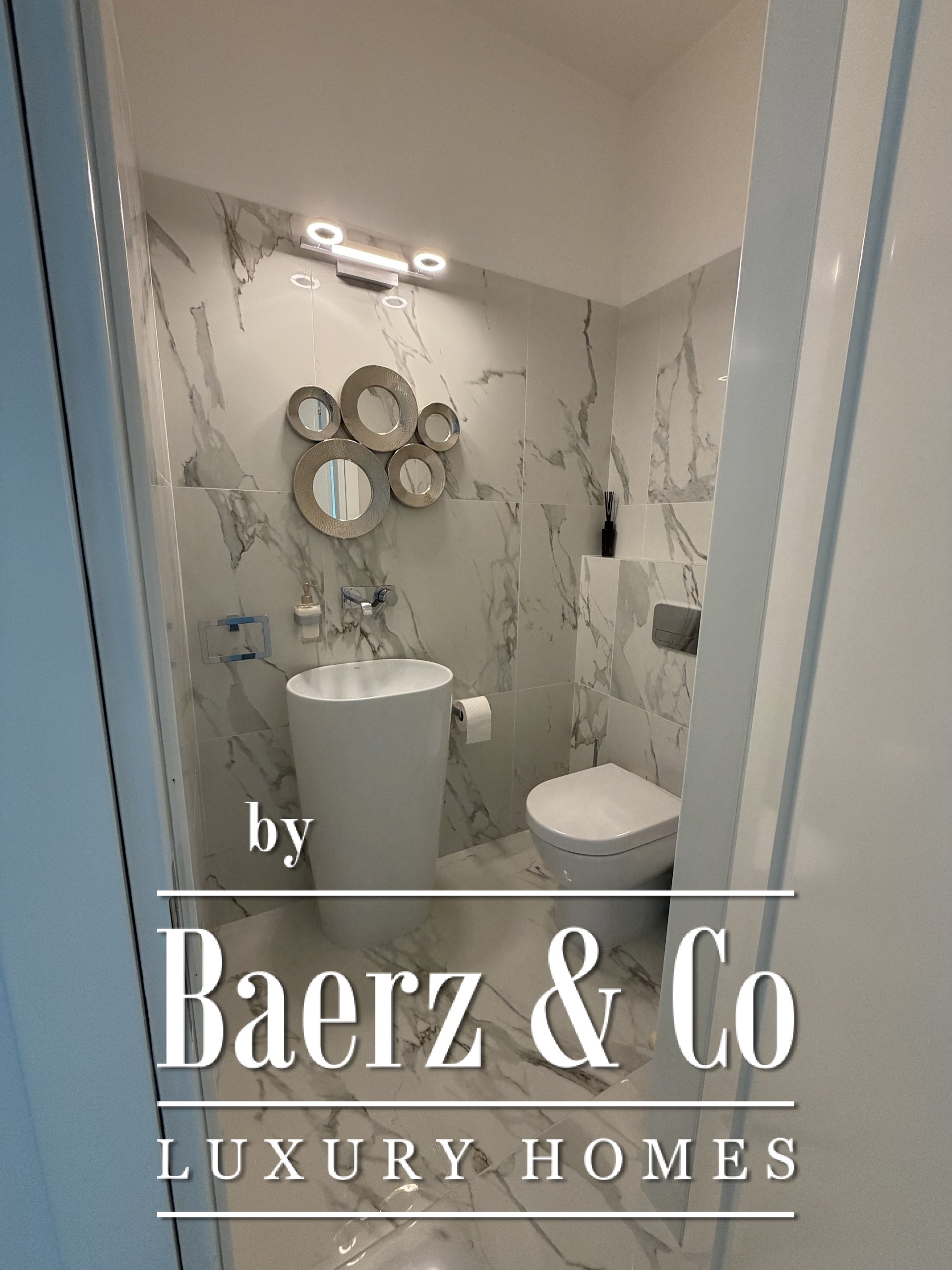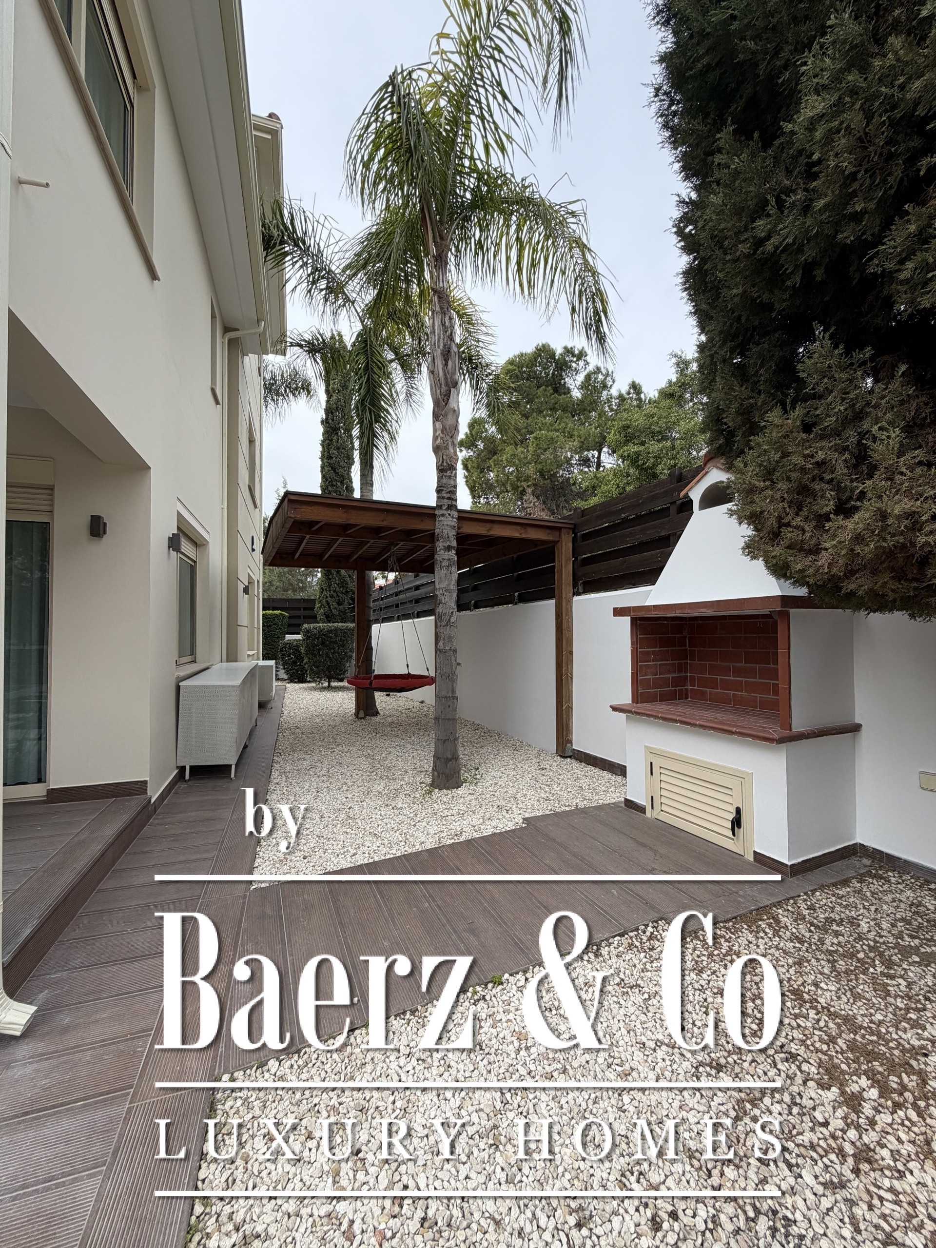 The fully furnished villa spans three levels with a 214 m² internal area on a 463 m² plot. Renovated in 2024, its five-bedroom layout includes five bathrooms and a guest WC. Four bedrooms reside on the second floor while the expansive master suite, complete with en-suite bathroom and a private storage room, occupies the top level. The kitchen faces the landscaped garden, complementing a separate dining area and a cozy living room anchored by a steam fireplace. Materials are elegantly matched with tiles, marble, and laminate throughout.