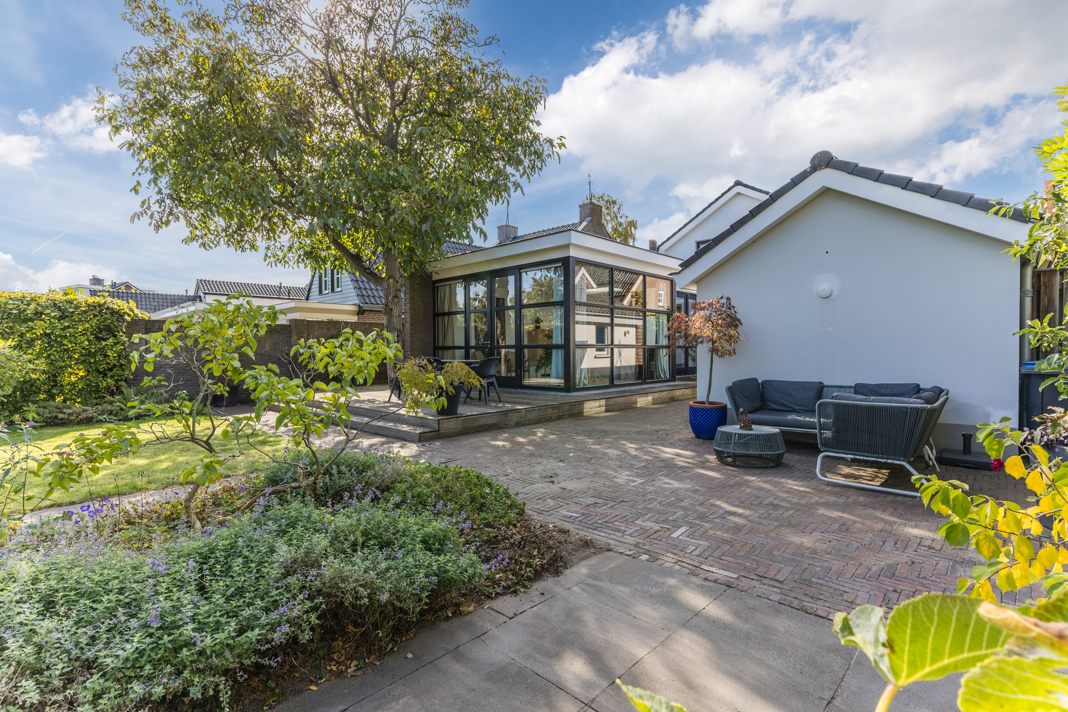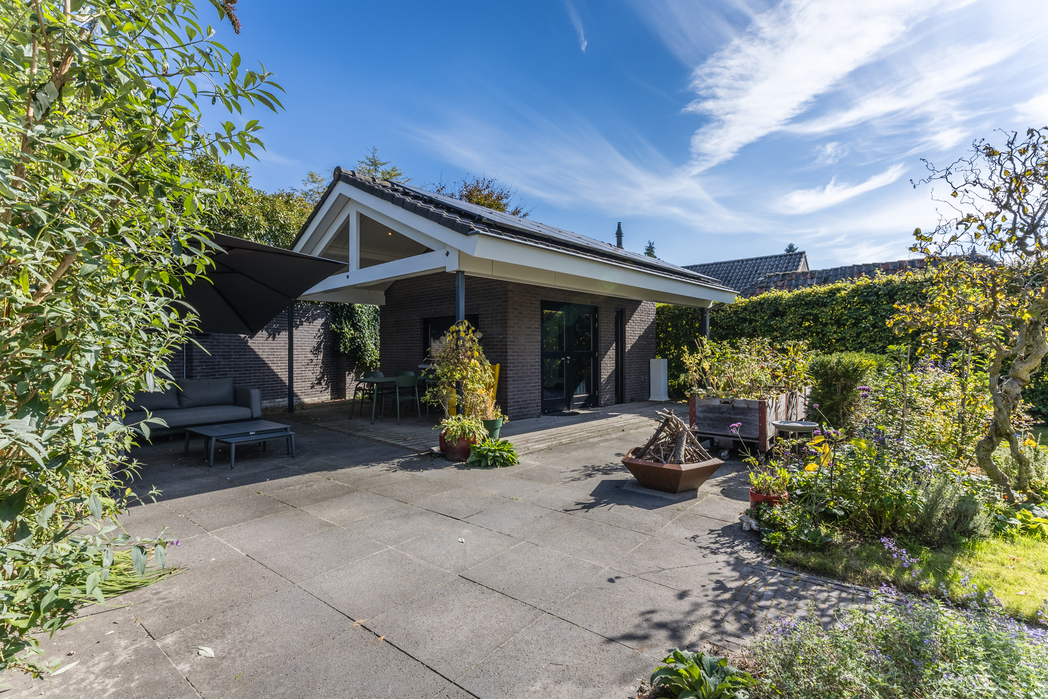 The beautifully landscaped garden is a true eye-catcher. With multiple terraces, a lawn, and borders filled with flowers and plants, it’s a wonderful place to relax and enjoy outdoor living. The property also includes a garage and a large driveway with space for multiple cars.