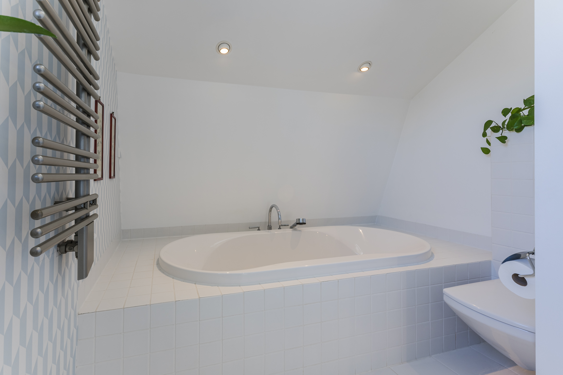 The tiled bathroom features underfloor heating, a bathtub, walk-in shower, wall-mounted toilet, washbasin, mirror heating, and adjustable mechanical ventilation.