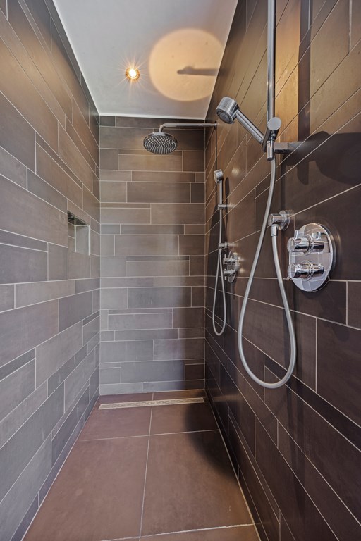 The bathroom is a showpiece: stylishly tiled, modern, and generous, with a bathtub, large walk-in shower, and double vanity.