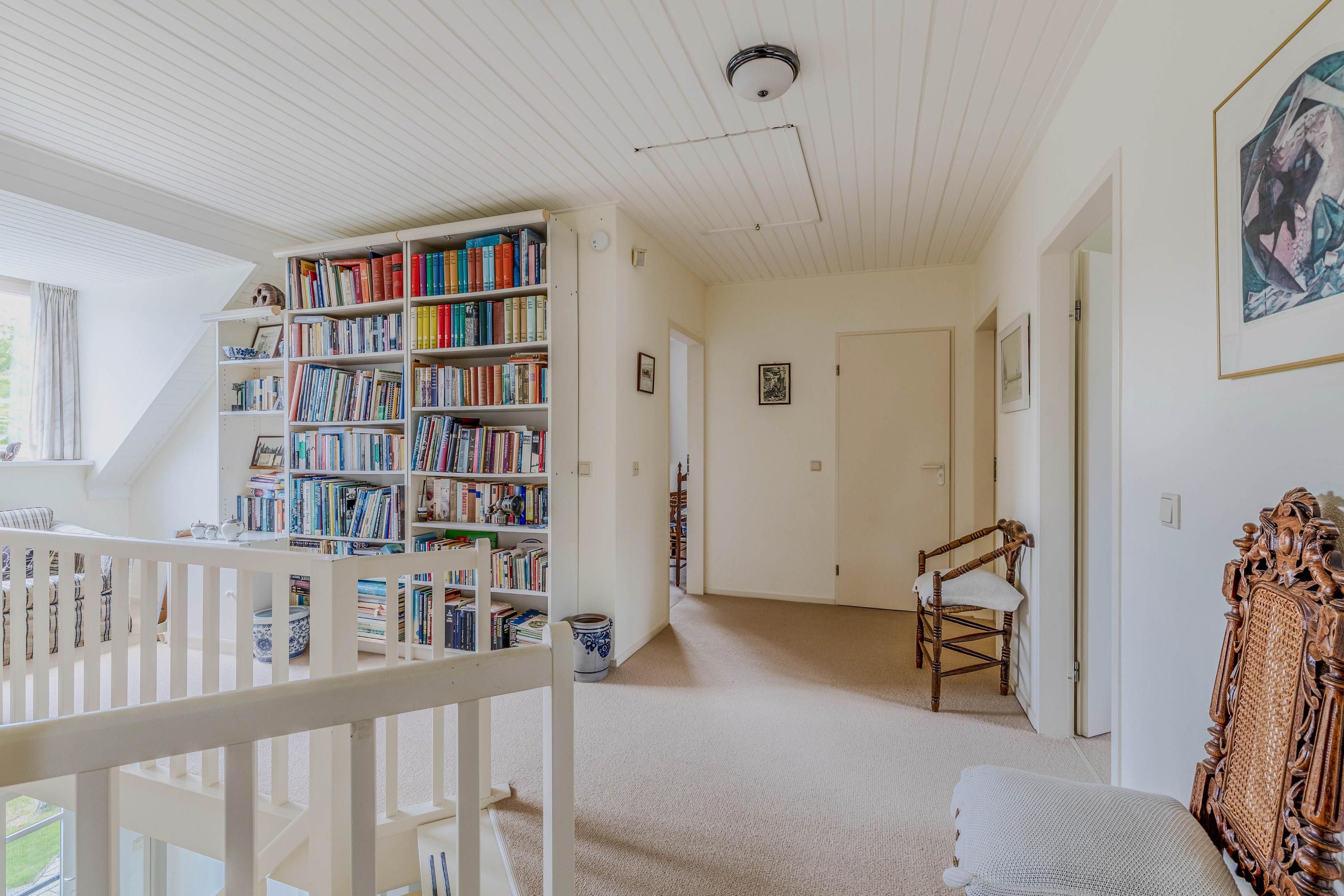 Enjoy a bright and spacious living room of 62 m² with a beautiful view of the landscaped garden. The living room features a bay window, a TV corner with striking architecture highlighted by a roof window, and a fireplace.