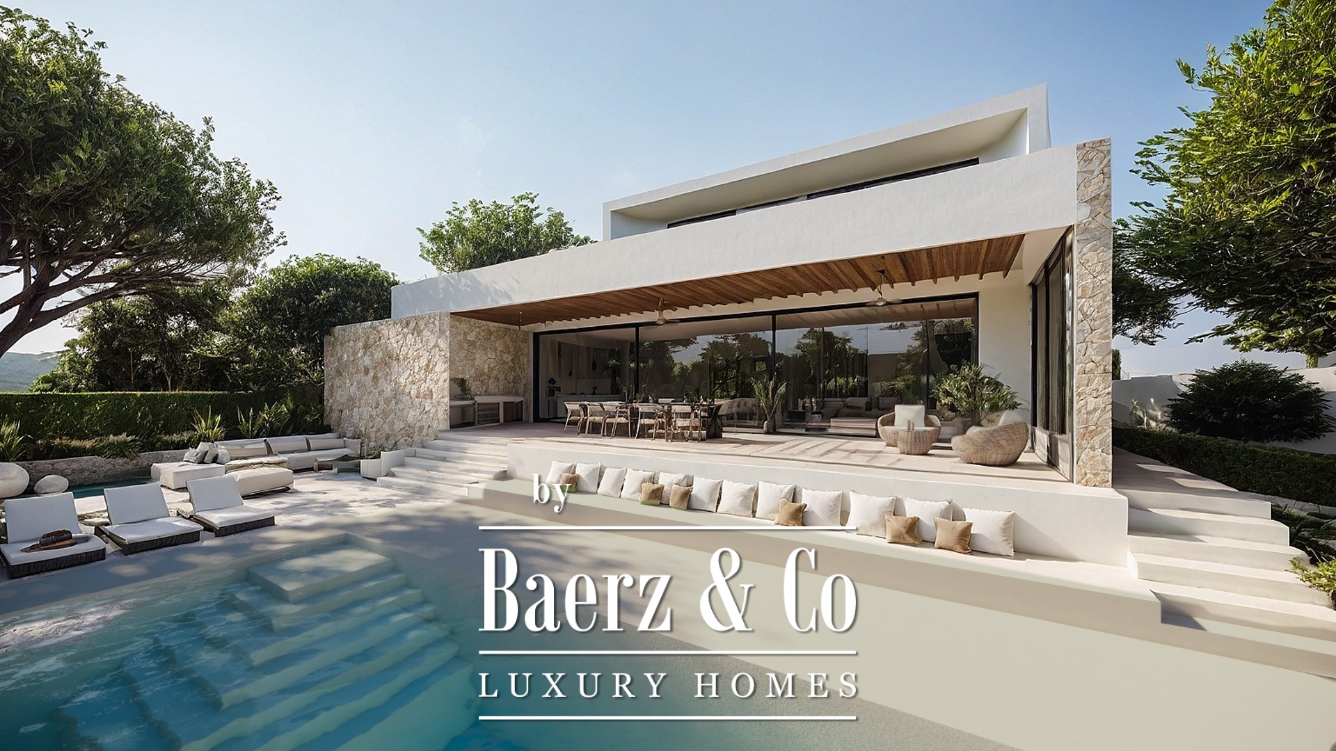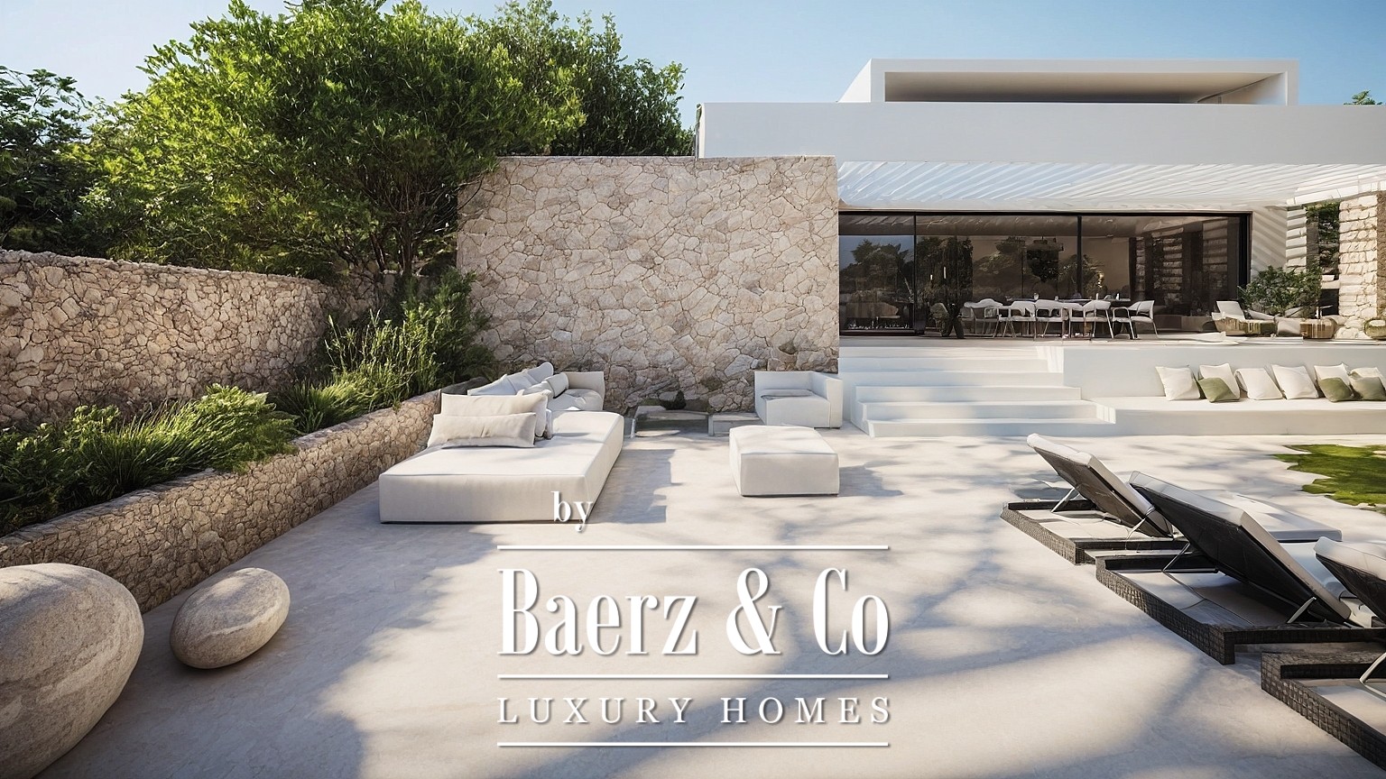 Upstairs, two master suites offer private dressing rooms and bathrooms, each oriented to capture the Mediterranean sea views, with two additional bedrooms ensuring flexibility and calm. Throughout, ceramic and natural stone, high-performance joinery, and considered details create a tactile sense of warmth and elegance.