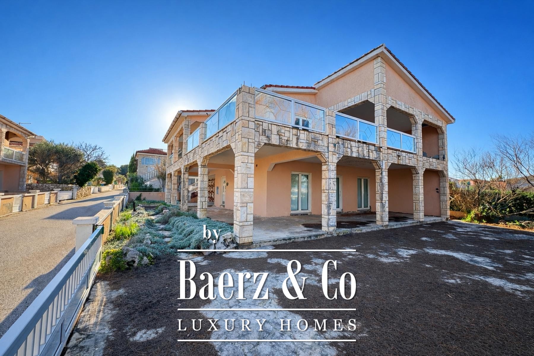 Built in 2006 and never lived in, the house awaits renovation, allowing for bespoke adaptation to individual taste and vision. The home rises over two floors: the ground level presents an open kitchen, dining and living area, bedroom, bathroom, terrace, and garage. The first floor opens to an additional kitchen, living and dining space, four bedrooms, two bathrooms, two separate toilets, and a terrace that commands unobstructed views of sea and sky.