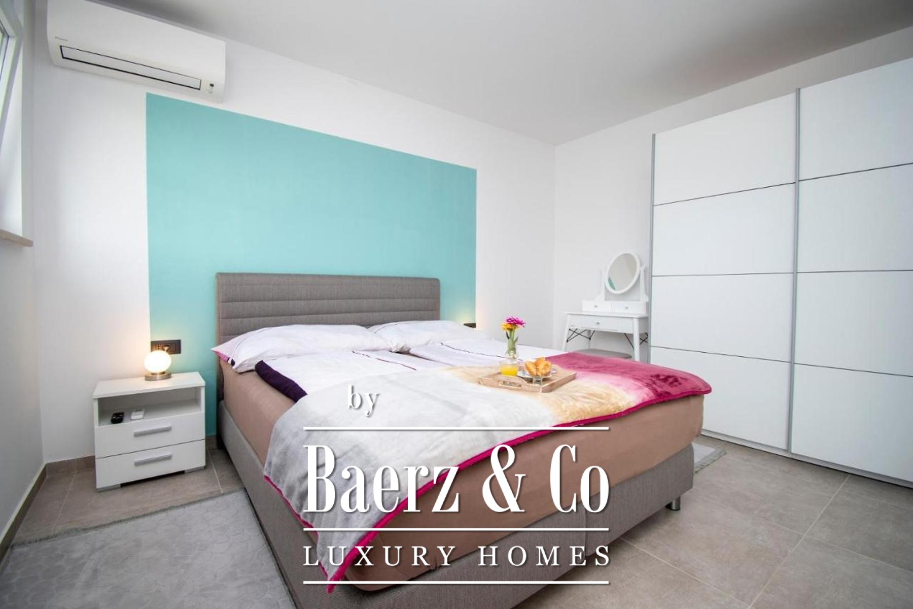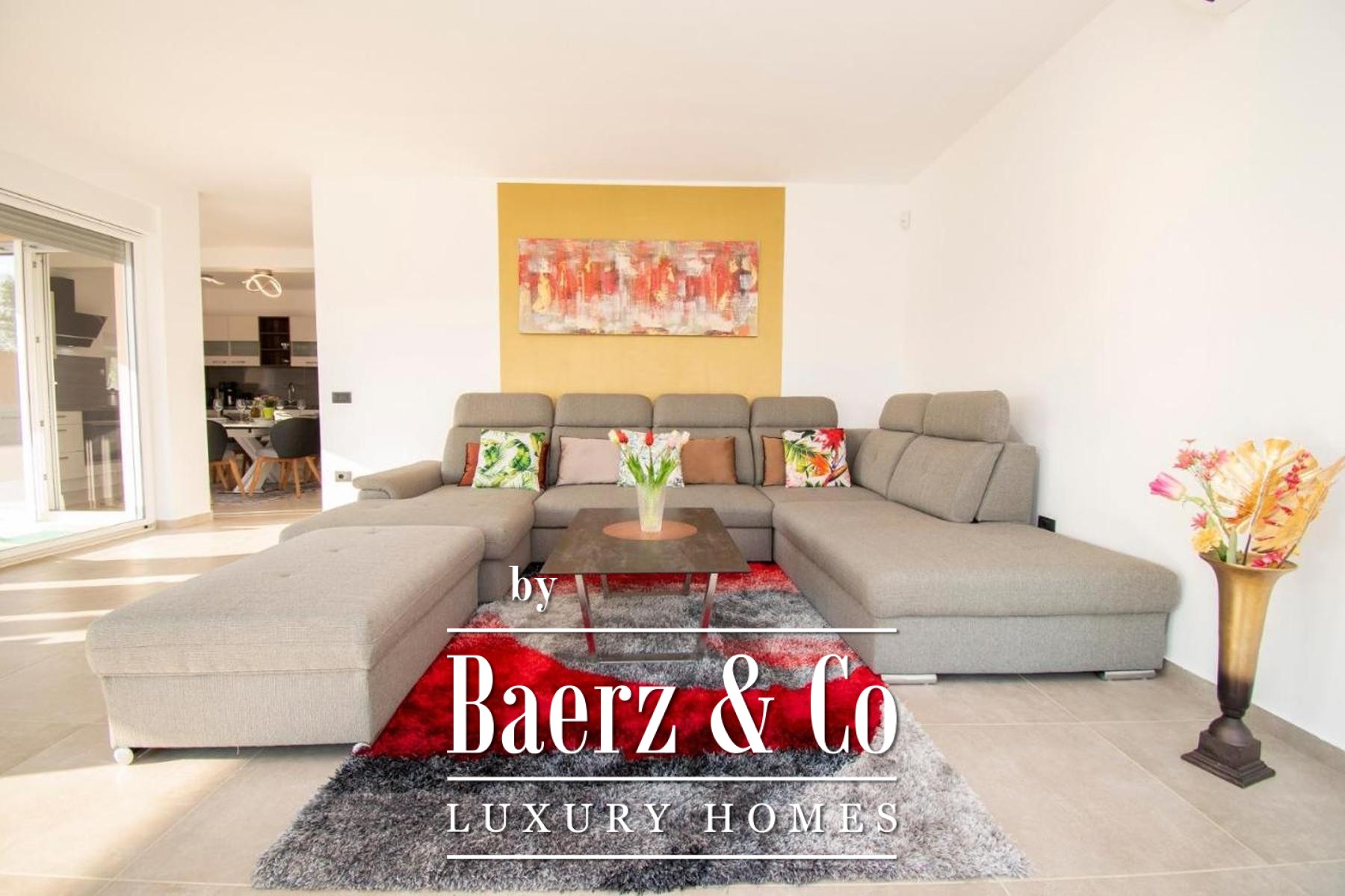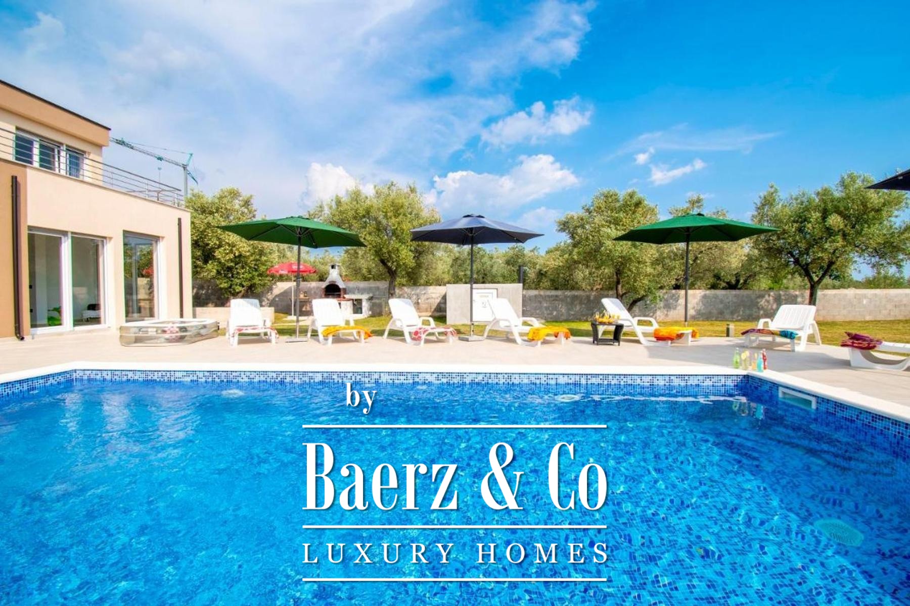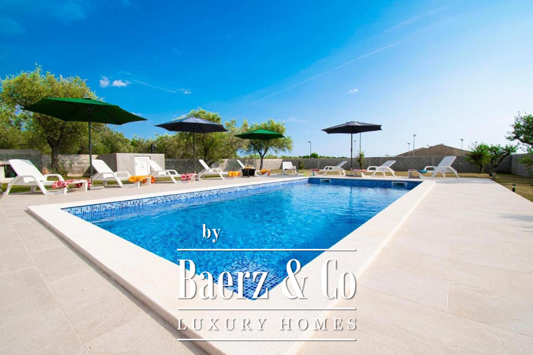 three bedrooms, each with its own bathroom, air conditioning, and television, as well as two terraces. The larger terrace also offers a sea view. In the enclosed yard of the villa, there is a pool, a children's playground, a barbecue, parking spaces, and an auxiliary building of 30 m². For more information, feel free to contact us!