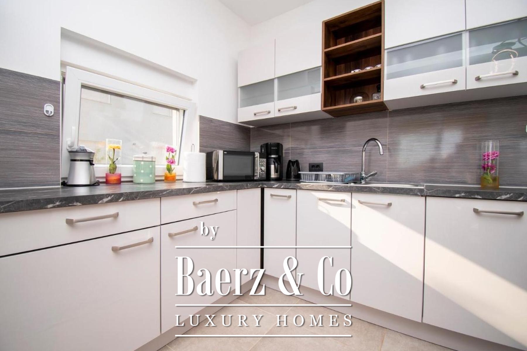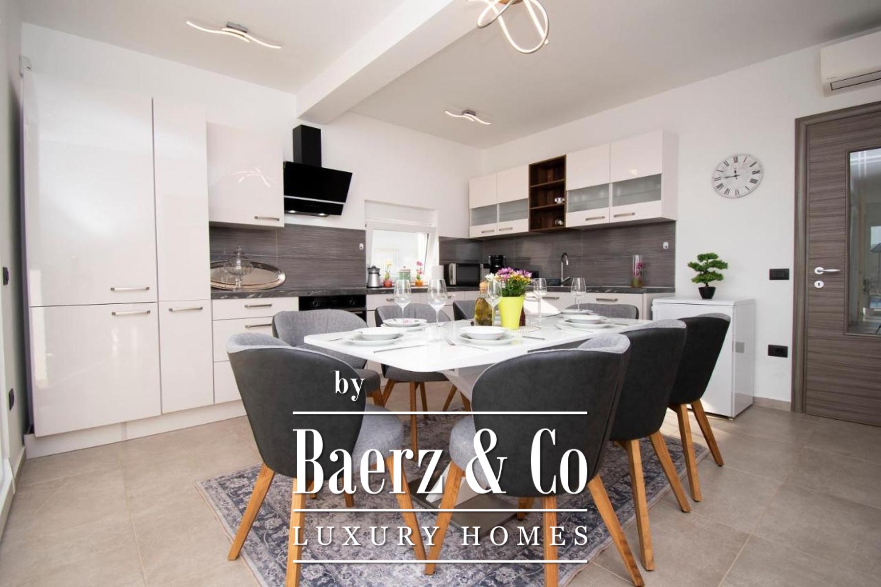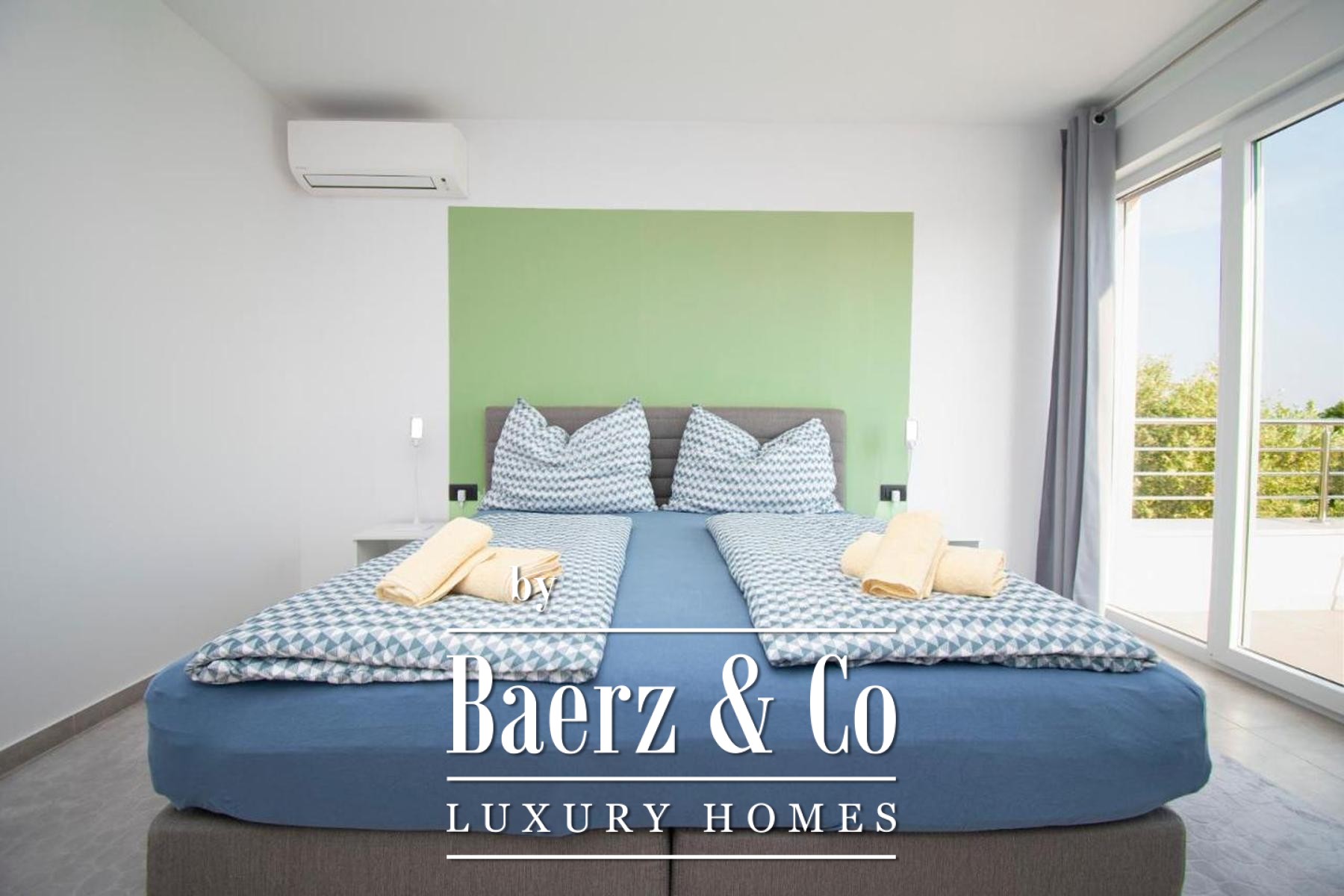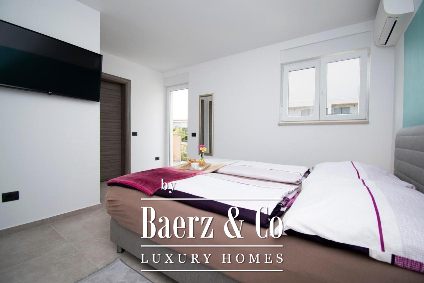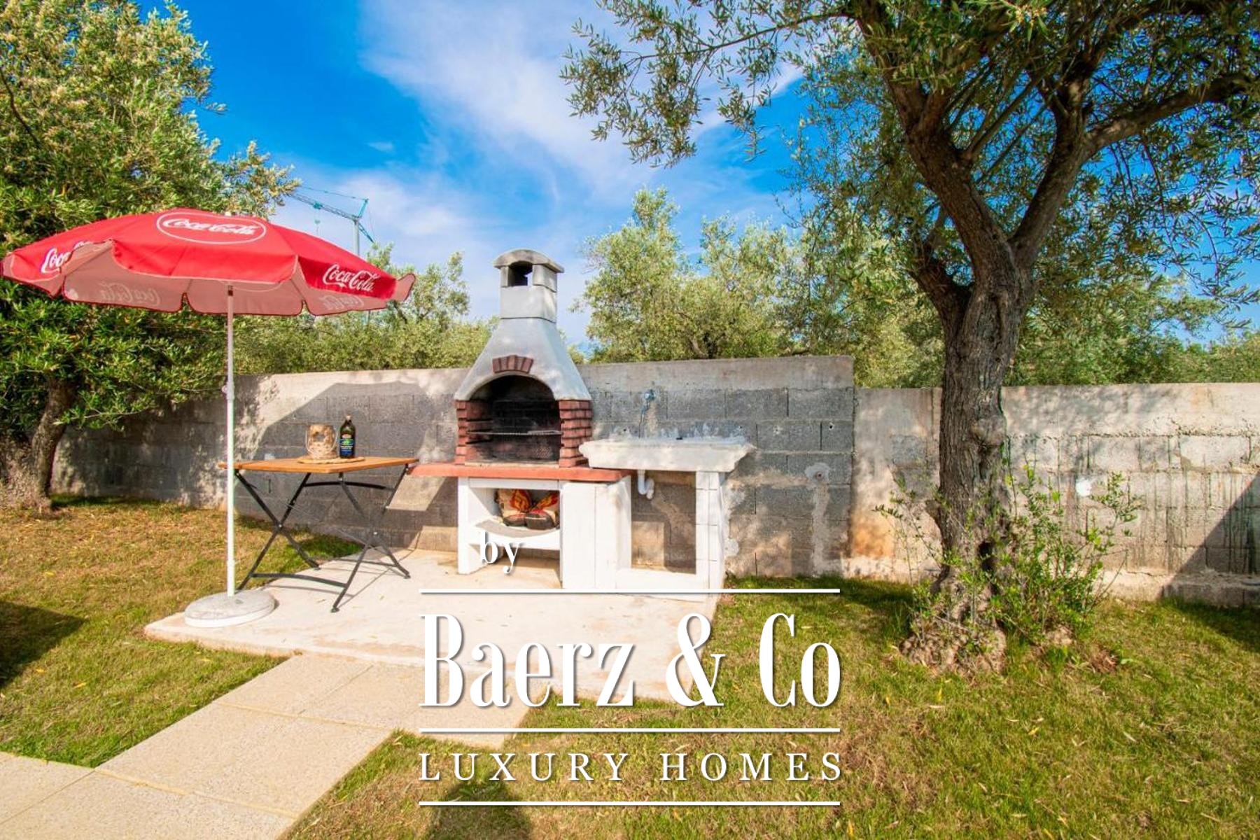 three bedrooms, each with its own bathroom, air conditioning, and television, as well as two terraces. The larger terrace also offers a sea view. In the enclosed yard of the villa, there is a pool, a children's playground, a barbecue, parking spaces, and an auxiliary building of 30 m². For more information, feel free to contact us!