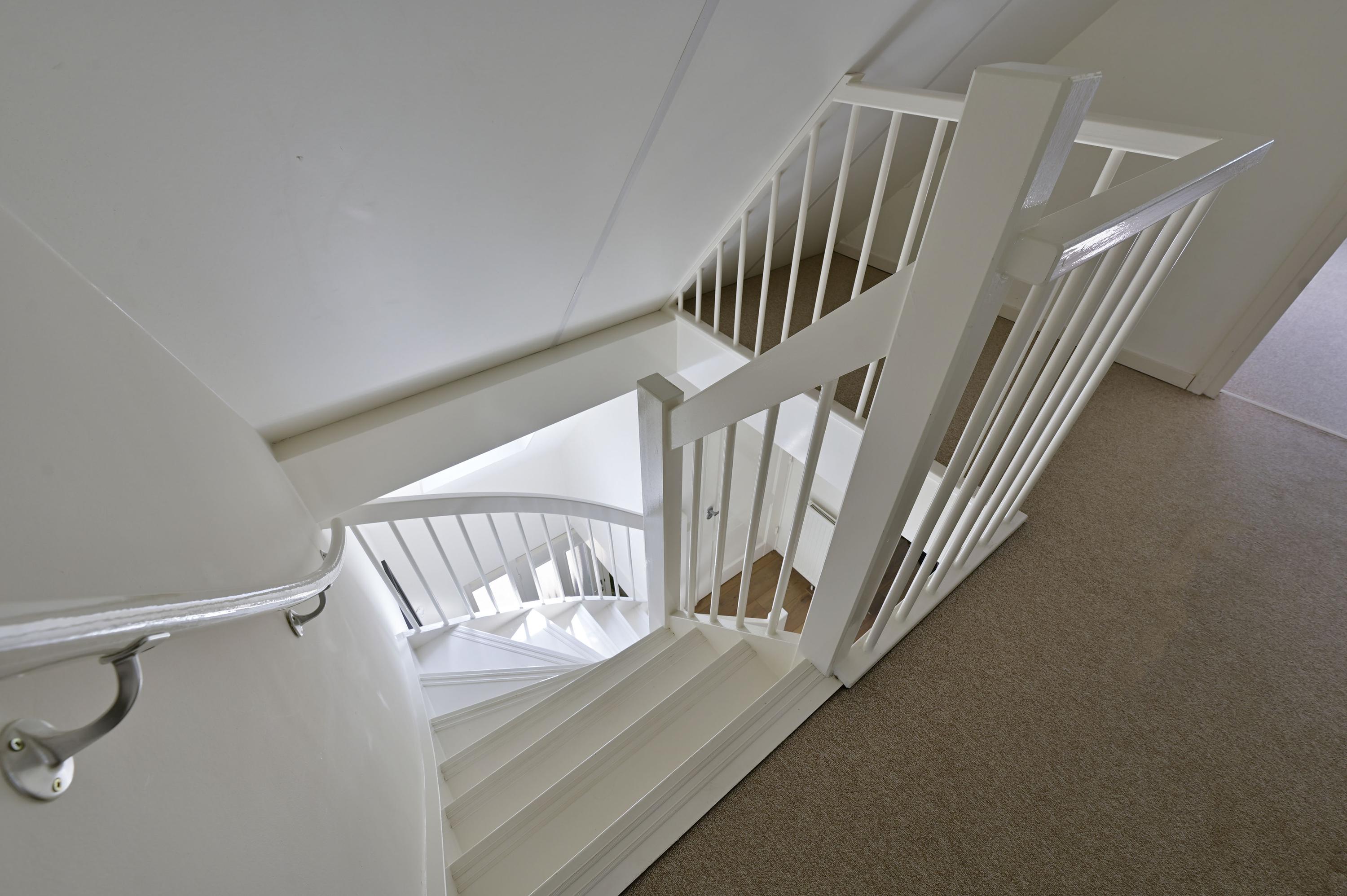 Upon entering the house, the spacious and tall staircase immediately catches the eye. Thanks to the large skylight above the stairwell, this central and highly representative hallway is remarkably bright. The hall offers a practical cloakroom, the meter cupboard, and a spacious toilet with a washbasin. From the hall, you enter the living room. This L-shaped living room is located at the front of the house and offers beautiful views of the front and side garden through the many low windows. A charming wood-burning stove (Dick Geurts) forms the cosy heart of the room. To the side is a delightful bay window with double doors leading to a decked terrace by the water — a perfect place to unwind.