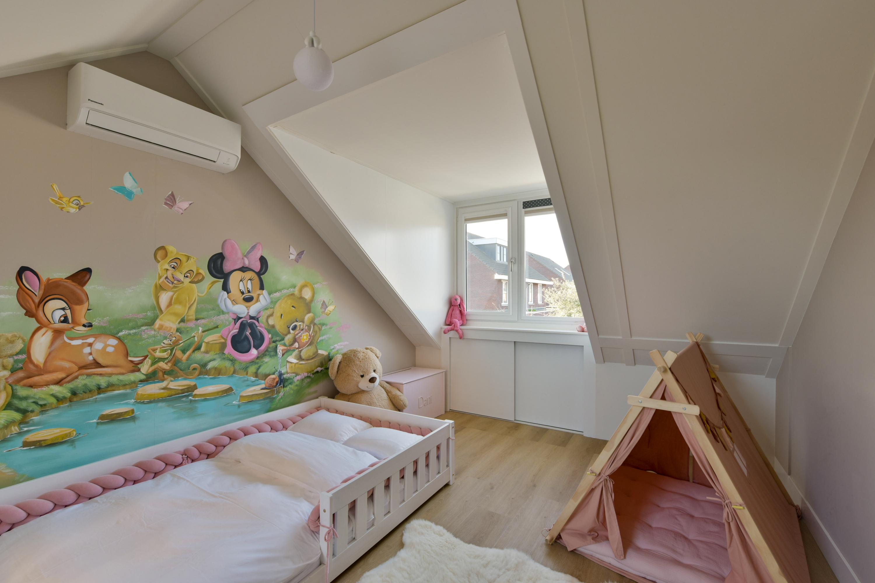 The spacious landing gives access to three generous bedrooms, all equipped with air conditioning. The largest bedroom at the rear is particularly versatile, split into two sections (this extra-large room can easily be divided into two smaller bedrooms). With a dormer providing additional light and space and plenty of storage behind knee walls and sliding doors, it serves perfectly as a master bedroom, office, or a combination of both.