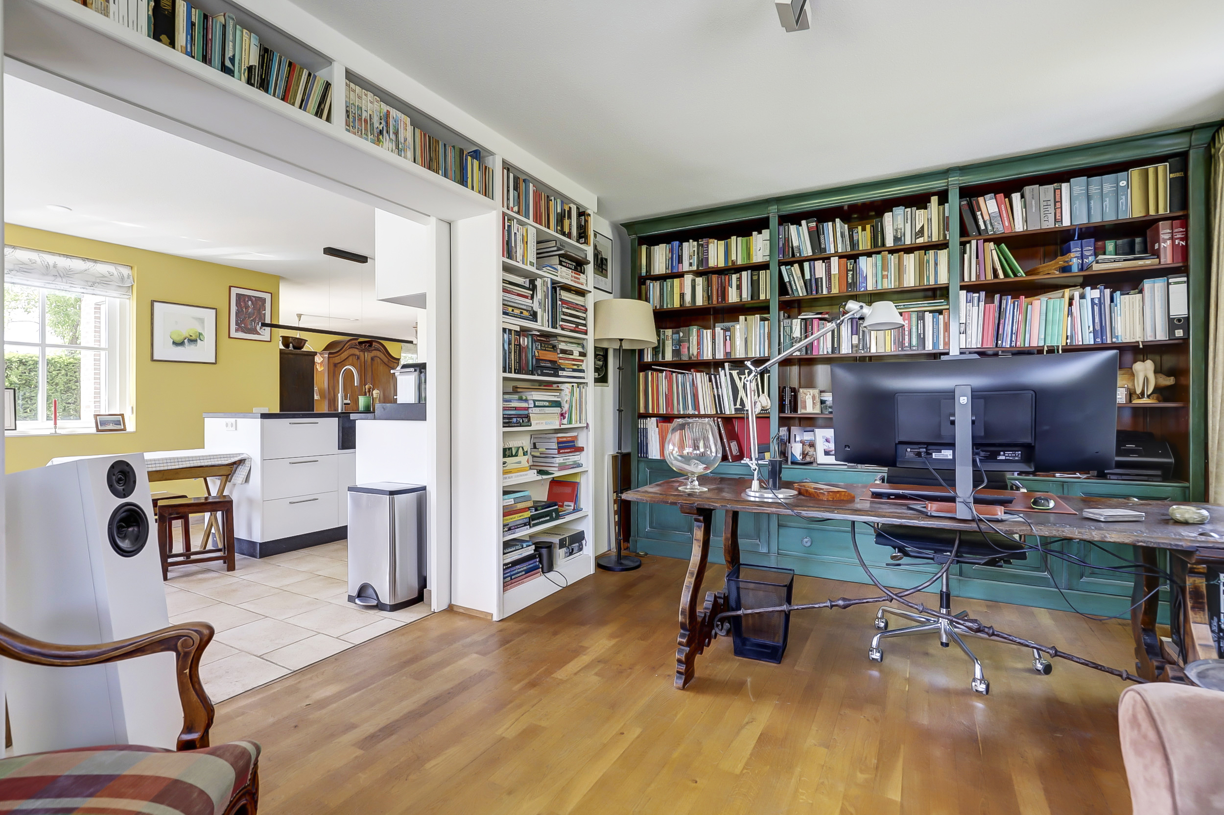 The house features a spacious, bright living room with a bay window and an atmospheric open fireplace. Large windows and French doors to the garden provide plenty of natural light. The living room connects to the spacious kitchen-diner, large enough for a generous dining table. Here too, French doors open onto the sunny terrace with veranda.