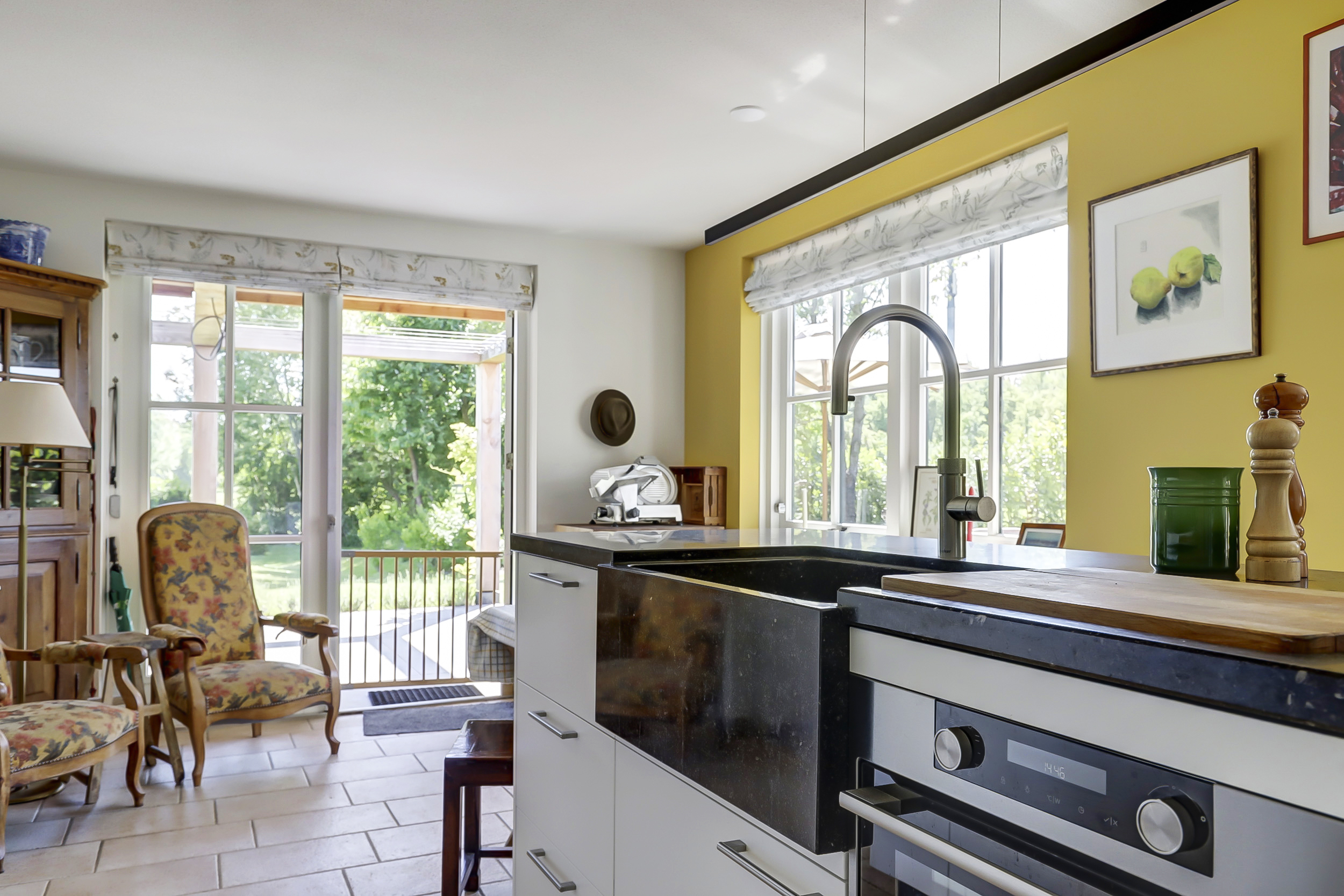 The kitchen, installed in 2023, is in pristine condition. It features matte white fronts and a robust natural stone worktop. It is equipped with every convenience, including a 4-in-1 boiling-water tap (Quooker), wine climate cabinet, fridge-freezer, dishwasher, combination microwave, and an extra-wide induction hob plus a gas wok burner and 90 cm convection oven.