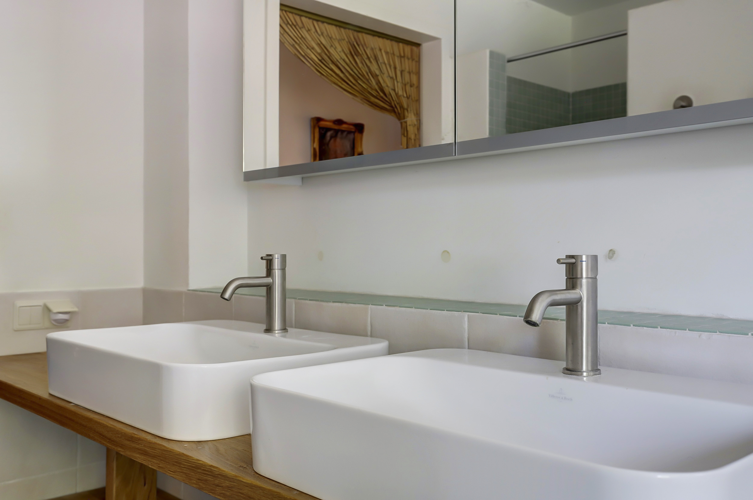 The house has a beautiful green garden all around, offering plenty of privacy, sun and shade. The heated saltwater swimming pool measures 15 × 4 metres and is fully automated for filtering and heating. The insulated electric roller cover retains heat and keeps the pool leaf-free.