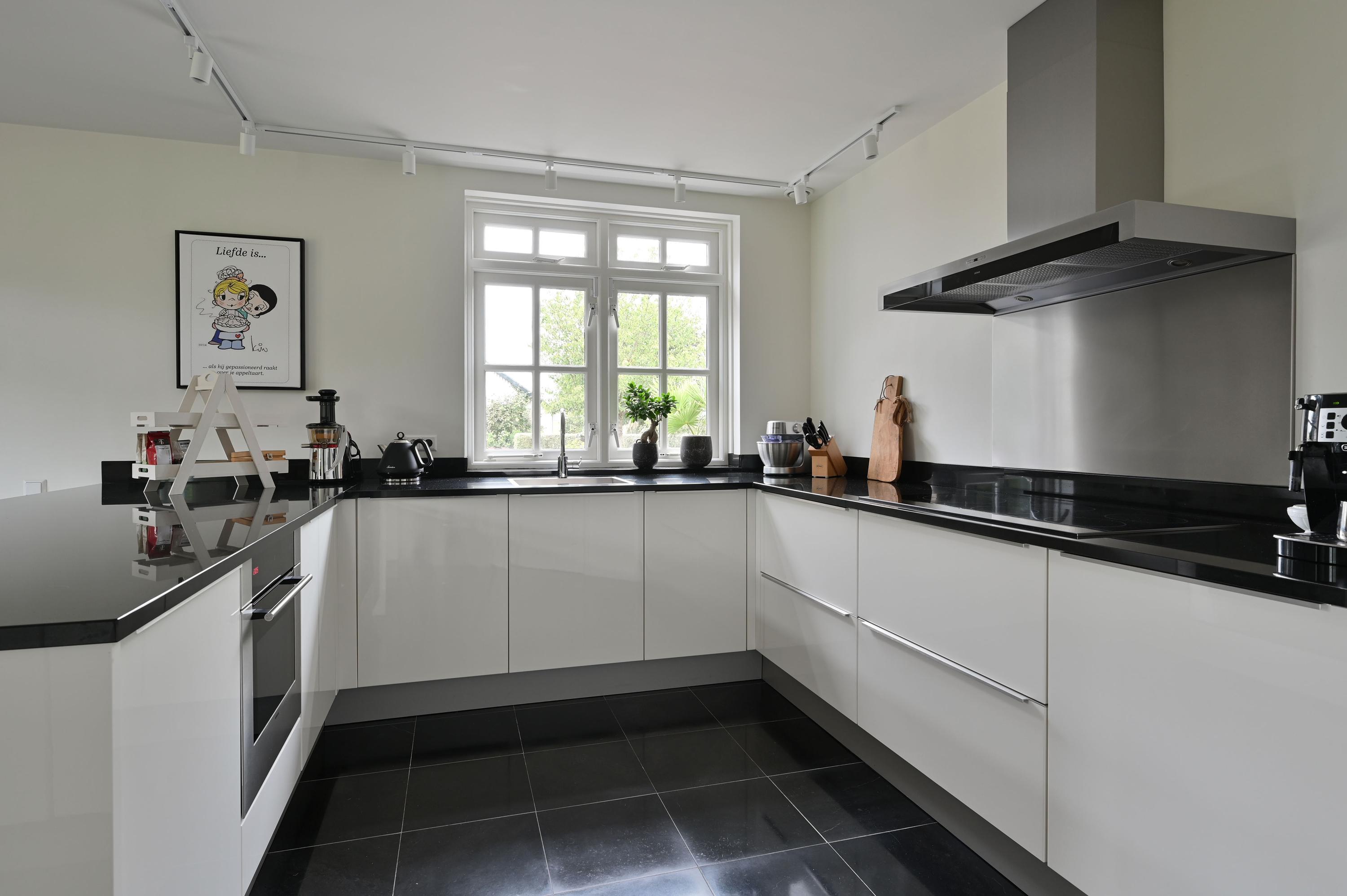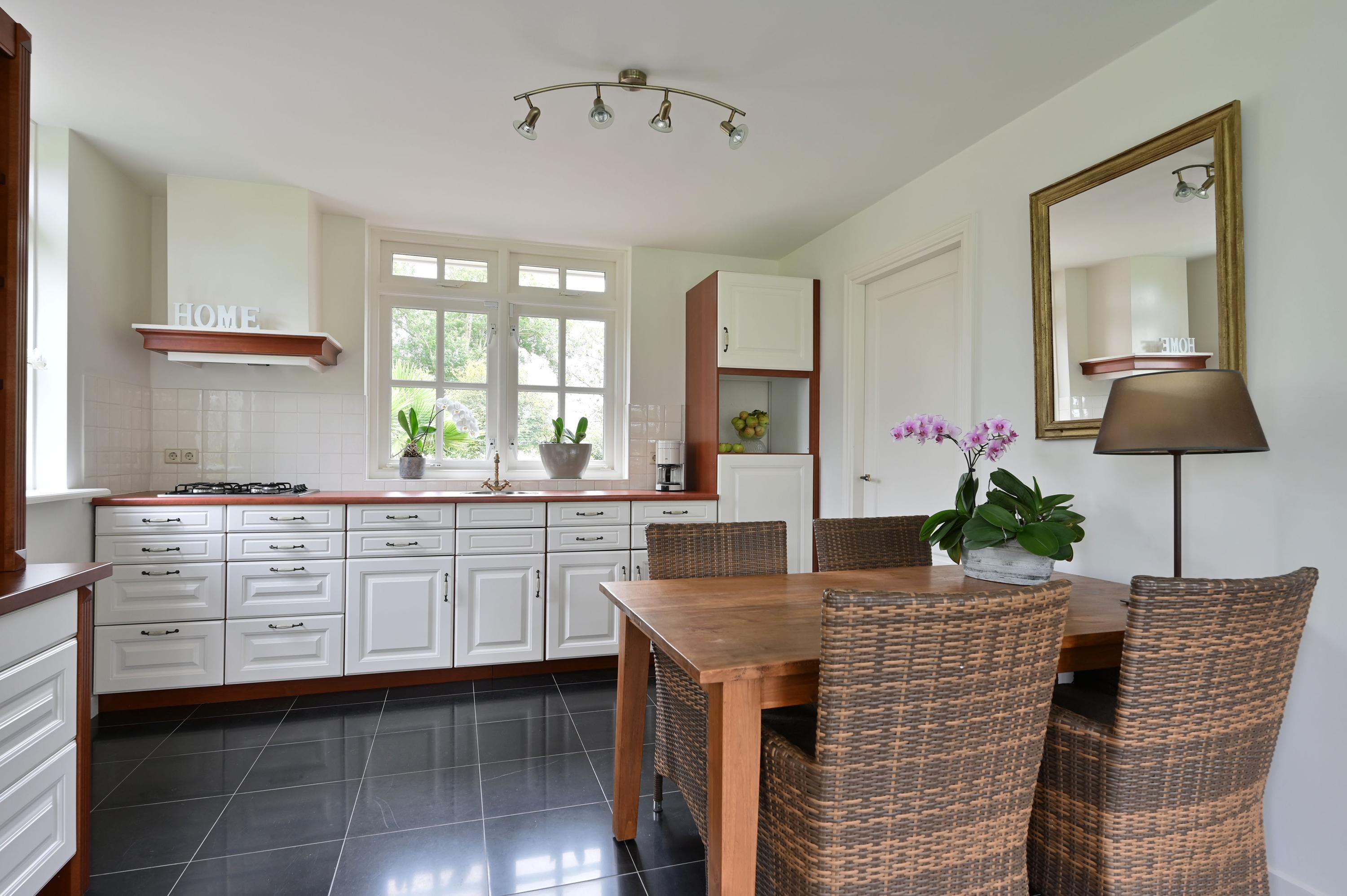 GROUND FLOOR You enter the home through the beautiful green and inviting entrance. The first thing you notice is the impressive hall with a stylish wooden staircase leading to the light-filled gallery. From this central hall, you have access to the guest toilet, the cloakroom, the upper floor, the living room, and the kitchen. The home exudes atmosphere and luxury. In the spacious, bright living room, the wood stove and the conservatory with French doors to the garden create a warm and cozy ambiance. The modern, luxurious kitchen is a place where cooking and gathering seamlessly go hand in hand. With a granite countertop, a stylish bar, induction cooktop, dishwasher, oven, refrigerator, and freezer, this kitchen is fully equipped. The ground floor features a hardstone floor with underfloor heating.