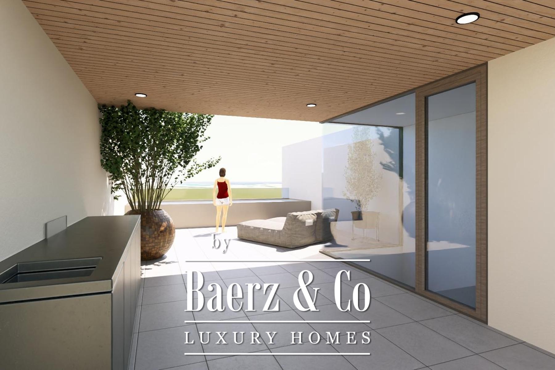 The ground floor welcomes with an entrance hall, living space, kitchen and dining area, leading by internal stair to the private quarters above. The first floor is composed of a master bedroom, two children’s rooms and two bathrooms, ensuring both privacy and flow for family life. The second floor extends outward, offering a covered and uncovered terrace, a swimming pool and technical spaces. Frameless glass walls, chevron oak parquet and Corten steel railings reflect a restrained sense of quality throughout.